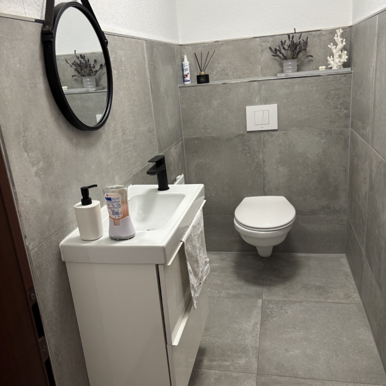 – Großes Bad im Souterrain mit Badewanne, Dusche & Doppelwaschtisch
