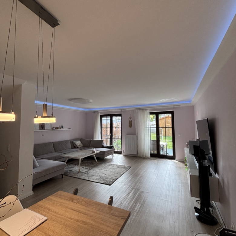 Die Immobilie erstreckt sich über Erdgeschoss- und Souterrainebene und bietet mit einer Wohnfläche von ca. 98 m² ein durchdachtes Raumkonzept mit viel Platz für individuelles Wohnen. Herzstück ist das großzügige, lichtdurchflutete Wohnzimmer mit angrenzender Küche und Gäste-WC – ein idealer Ort für entspannte Abende und geselliges Beisammensein.